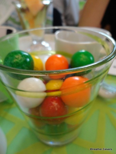 After we were stickered up, we started on lunch. Fresh cups of fruit salad were sitting at out place settings along with cups of carrot & celery sticks, grapes, and colorful gumballs (one of the most important food groups, right?).