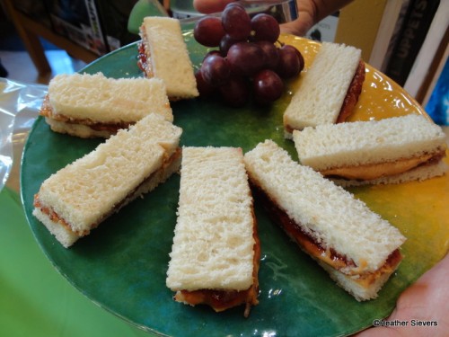 While we were eating our salad, our fabulous cast members walked around with bottomless variety trays of finger sandwiches. First up was the kid pleaser, good ol’ PB & J, on white bread. Which, by the way, always tastes better when someone else makes it for you.