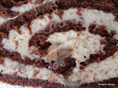 Side View #2: On this side of the Yule Log, you’ll notice the whipped topping with holiday sprinkles. The topping was very light, sort of like a Cool Whip-type topping, which was refreshing because the chocolate frosting on the cake was pretty serious.