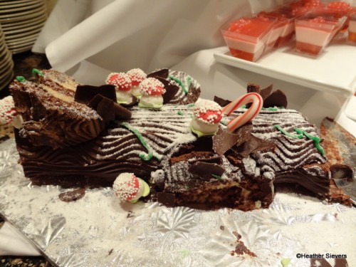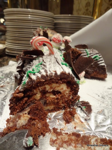 The Yule Log cake was easy to find; you practically run into it upon entering the restaurant. It’s on display in the center of the room at the salad/dessert station. There are, however, none for the taking; you must ask for it and it is taken out of a small refrigerator behind the glass.