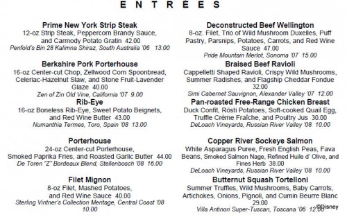 It’s interesting… the decor really looks as if it would fit better at The Wilderness Lodge. Maybe it’s those lamps. This is one of those places I’d love to try, but probably won’t get around to anytime soon as one of my party is a vegetarian and, while there is butternut squash ravioli on the menu, there’s really not enough variety to make it worth his while (which makes sense, it being a steakhouse and all!)