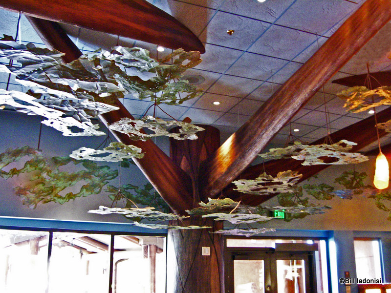 The tables and chairs are plain and Spartan, but overhead are metallic cut-outs that resemble tree leaves, and several support posts that have large wooden beams resembling tree limbs make it appear as though you are under the jungle canopy. In fact all the support beams are made to look like trees.