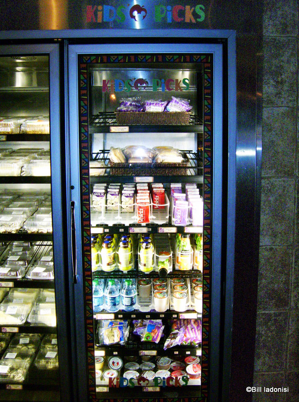 Straight ahead is the Kids’ Picks and the “Grab N’ Go” cooler where you can get a quick sandwich, salad, dessert, fruit cup, or beverage if you are anxious to get to the parks (you can even get the resort’s famous Zebra Domes or Hummus, which are served at Boma upstairs)!