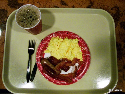 What we like about the Mara is that you can customize your breakfast platter. For example, I am a health nut and avoid carbs. If you order the Bounty Platter, it usually comes with scrambled eggs, breakfast potatoes, biscuit, small Mickey waffle, and sausage and bacon for $8.29. But I just wanted the eggs, bacon and sausage, which I got for $6.79.
