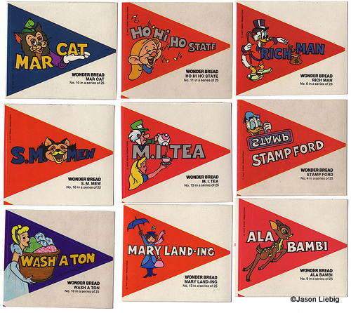 These classic pun-tastic illustrative stickers were part of a Wonder Bread campaign in the 1970s (you could find the stickers in your package of Wonder Bread)! There were 25 of them altogether.