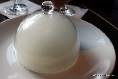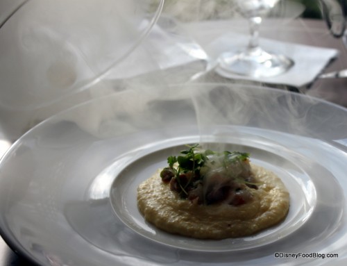 Next up on our tasting menu: the Shrimp and Grits with Tasso Ham and Tomatillo Chutney. Now, how cool is this presentation? Chef Sears wanted to include a smoked flavor, but didn’t want it to be too strong. His solution? Add a touch of smokiness by serving the plate under a dome of flavor!