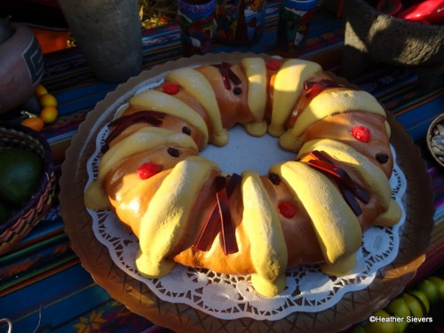 Topped with candied fruit bits to make it look jeweled, the Rosca de Reyes features a whole hidden almond inside. It’s tradition that the person who finds the almond will have good luck. My husband was the lucky one!