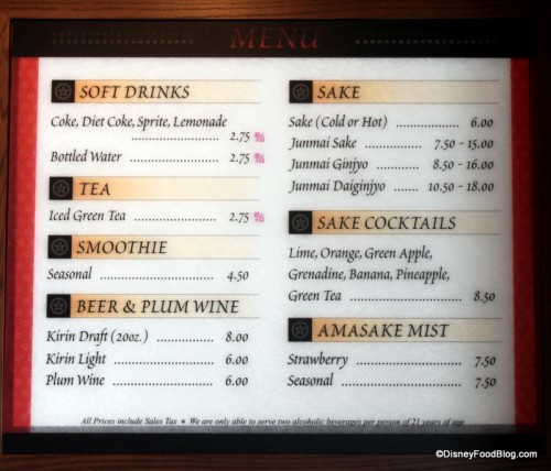 Oddly, the Tokyo Sunset — which was available as a signature drink at the Japan booth during the Epcot Food & Wine Festival this year — is also available. No sake in there, though!