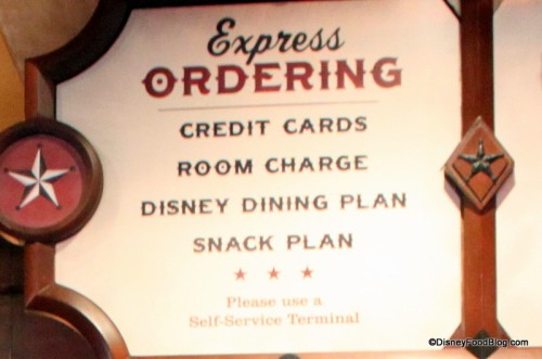 The express ordering option opens with the question of whether or not you’re on a Disney Dining Plan so that it can charge your card correctly. And once you’re ready to pay, you have multiple choices, including your room key, a Disney gift card, a credit card, or a Disney Rewards Card. I think this is a great way to keep things streamlined!