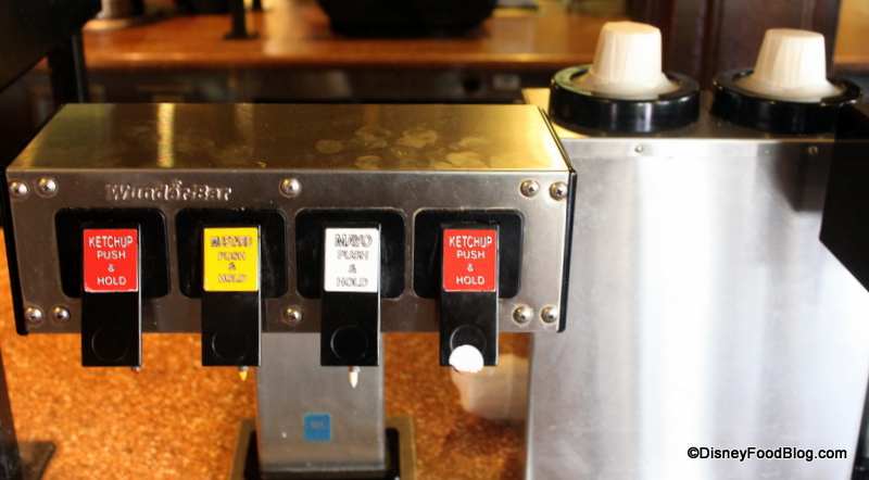 Of course, there’s ample mustard, ketchup, and mayo (in those annoying dispensers that end up squirting out more stuff even after you’ve stopped pressing the button…tip: stop pressing the button when your cup is about 3/4 full!).