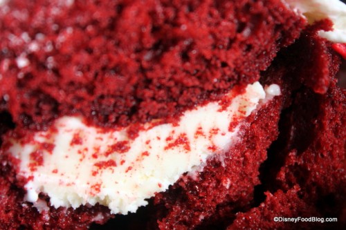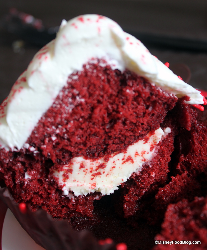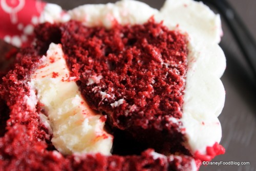 Inside the cupcake we have a wonderful surprise — as we do with all Contempo Cafe cupcakes! Here we have a serious cheesecake center, and by that I mean it’s straight cheesecake in there! My experience here reminded me of when Heather and I first tried the red velvet cheesecake cupcake at the Plaza Inn in Disneyland!