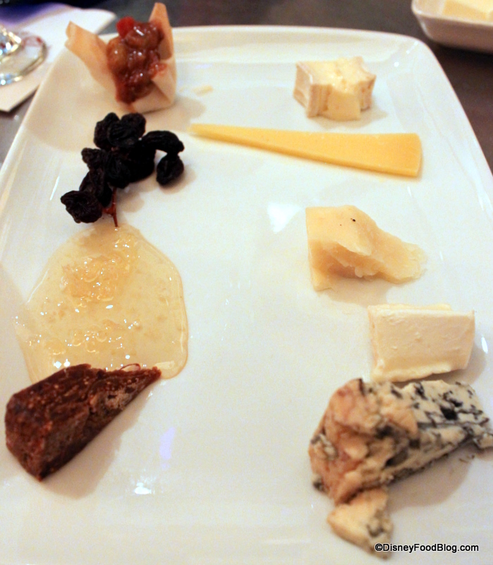 We started out the meal with the cheese plate (of course). This included five cheeses — Brillat Savarin, Plesant Ridge Reserve, Fiore Sardo, Vermont Butter and Cheese Co. “Bijou”, and Fourme d’Ambert. Accompaniments included raisins on the vine, fig and almond torta, Savannah Bee Company honeycomb, and a spiced California peach, golden raisin, burnt orange, andn white balsamico compote “agrodolce.”