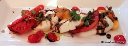 Another artisanal salad, the Fresh Mozzarella di Bufalo with yellow beefsteak, “ugli ripe” and tiny heirloom tomatoes, balsamic glaze, exotic peppercorns, and petite basil with Sicilian Olio Verde, also got high marks. The pleasingly bright colors and display set the stage for the light, fresh taste of the mozzarella. A great starter!