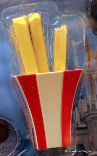 I love the details like the little tiny rice krispies and uneven texture of the treat. There is good texture on the chicken leg too – you can see the grain of the meet. The salt on the pretzel is a great touch and looks to be about the right size too. Finally, the chocolate pour on the Mickey Bar doesn’t appear to be an even thickness, which is a great touch. I am disappointed by the popcorn, fires, and drinks. The containers are generic and have no Disney branding. Everything at a Disney park has branding, so this seems like they manufacturer took an existing toy food mold and stuck it in the set. At least they tried with the generic hot dog and stuck some strange Mickey shaped catchup? Shots/jimmies/sprinkle? What is that?