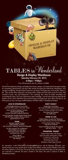 This is your opportunity to peek “backstage” and see historical Disney pieces like the Nautilus and Mr. Toad’s Wild Ride! Come meet the Design and Display team, learn about what they do, see all the props up close, and enjoy a Buffet Reception with fellow Tables in Wonderland members! (Click the image to the right to see details full-sized. Scroll down to see how to book as well as the menu all typed out.)
