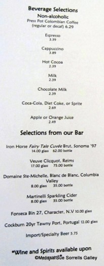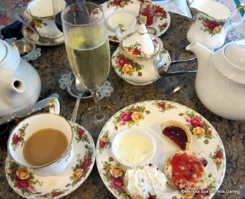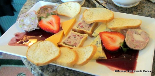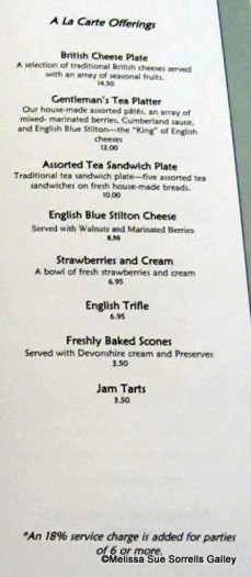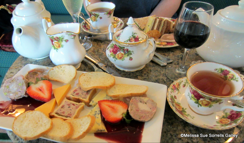 My husband ordered the Prince Edwards Tea. An almost British-style cheese plate, his meal included three types of paté, cheese, marinated berries, and Cumberland sauce. He also received scones with Devonshire cream, a pot of tea (Darjeeling for him) and a glass of port. The port was complex and mellow, and he enjoyed it.