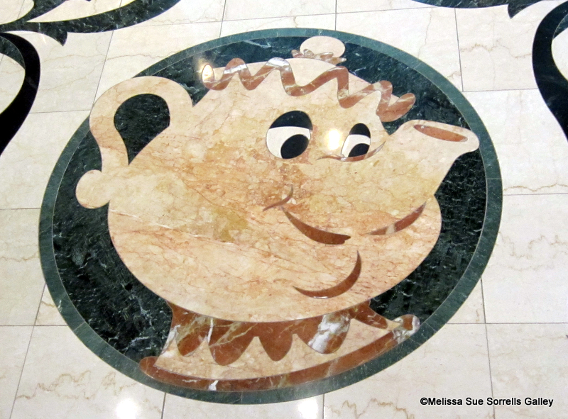 After hopping off the monorail we found the waiting area for the Garden View Lounge, which is located on the bottom floor of the Main Building lobby. The waiting area is extremely charming — though too small — and has Beauty and the Beast characters Chip and Mrs. Potts inlaid into the tile floor. How cute!