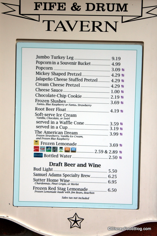 What I’ve realized in the past couple of months as Fife and Drum has added to their menu is that this spot seems to be a magnet for Disney food cult favorites as well as obscure, random items! Classics like turkey legs, popcorn, and cream cheese pretzels are coupled with rarities like the American Dream slushie and frozen Jim Beam Red Stag lemonade!