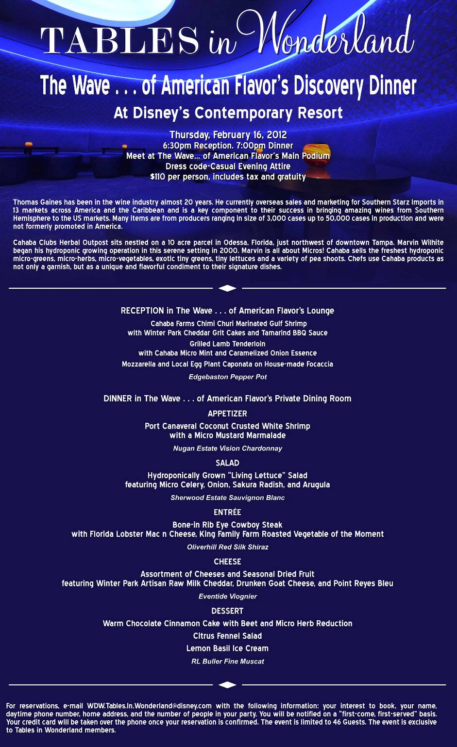 For reservations: e-mail [email protected] with the following information: your interest to book, your name, daytime phone number, home address, and the number of people in your party. You will be notified on a “first-come, first-served” basis. Your credit card will be taken over the phone once your reservation is confirmed. The event is limited to 46 Guests. The event is exclusive to Tables in Wonderland members.