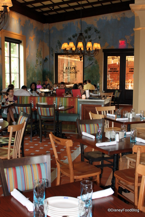 This was DEFINITELY our FAVE restaurant on our trip in Dec. We’ve been to Italy so had some high expectations and this pizza was really delicious! Now I am a boring pizza person,black olives only for me so I went waaaay out of my comfort zone and ordered the Carciofi(butchering the name of course)and boy,was I glad I did!! TO DIE FOR!! My hubby had ordered the Rigatoni con crema et pollo and I tried to tell him it was silly not to get pizza and he wished he would have listened! The pasta was good but didn’t come close to the artichokey,truffley goodness that was the Carciofi! The arancini were awesome,as well as the zeppole&ugly but good sundae! We sat in the small area right before the “porch”area and we found it quite pleasant,not too noisy at all. This is at the top of our list of “must scarf at again” places at WDW!