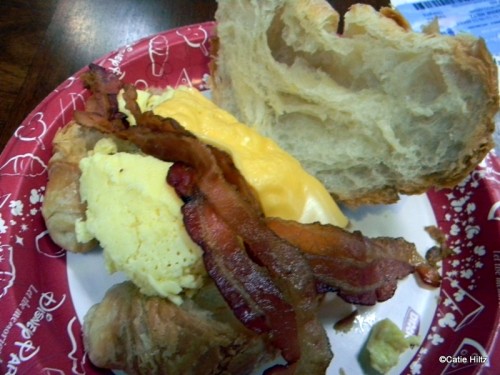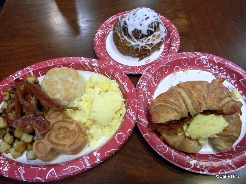 My husband chose the cinnamon roll (which unfortunately was not included in the Disney Dining Plan, but the cashier let him use it as a snack credit so we didn’t have to pay out of pocket, which was nice!) and the bacon egg and cheese croissant.