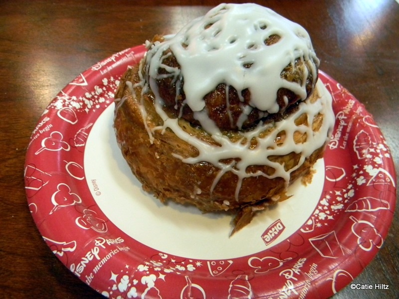 The cinnamon roll was different from others at Disney. It was flaky and light (similar to a croissant), and had a strong cinnamon flavor. The icing was more of a royal icing and was hard and dry on the roll.