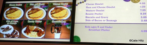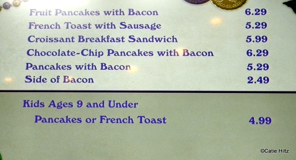 We used the Disney Dining Plan to pay for our breakfasts (1 counter service credit will get you an entrée and a drink at breakfast time). But if you plan to pay out of pocket, you can expect to pay $6-$9 for most breakfast entrees, and around $3 per beverage.