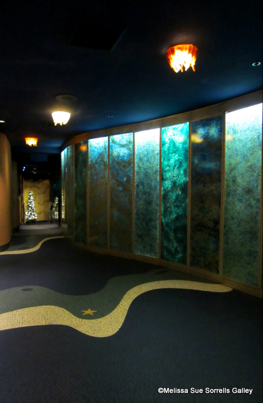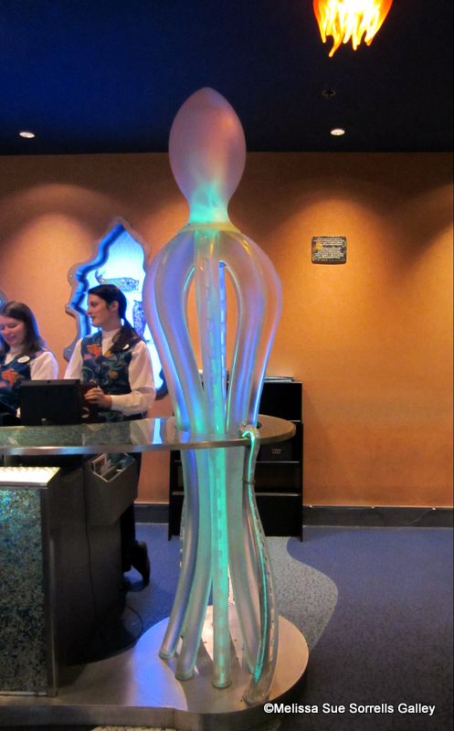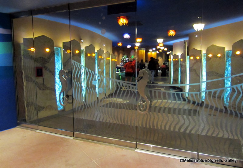 We were a bit early for our ADR and there were a lot of other families waiting to be seated, but we were whisked back to the dining room right on schedule. Down the long, slightly curved, almost undulating hallway, we felt like we were being transported deeper and deeper beneath the waves.
