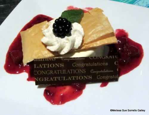 Because it was our honeymoon, our waiter told us dessert would be on the house. This was awesome! After dinner it took about 20-25 minutes to get this dessert. When he brought out the dessert he asked if there was anything else he could get. I would also like to note that I had finished my Bahama Mama long before now and was never asked for another. I took this moment to remind him of my water that I ordered about 90 minutes prior. This quickly came… after dessert was finished.
