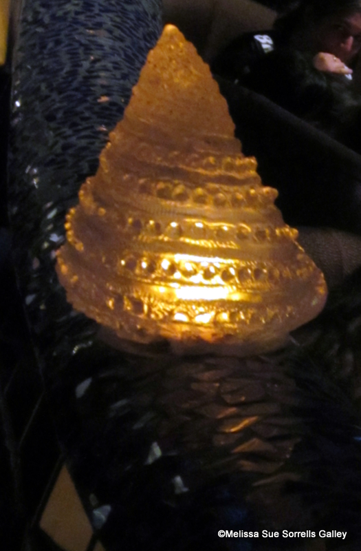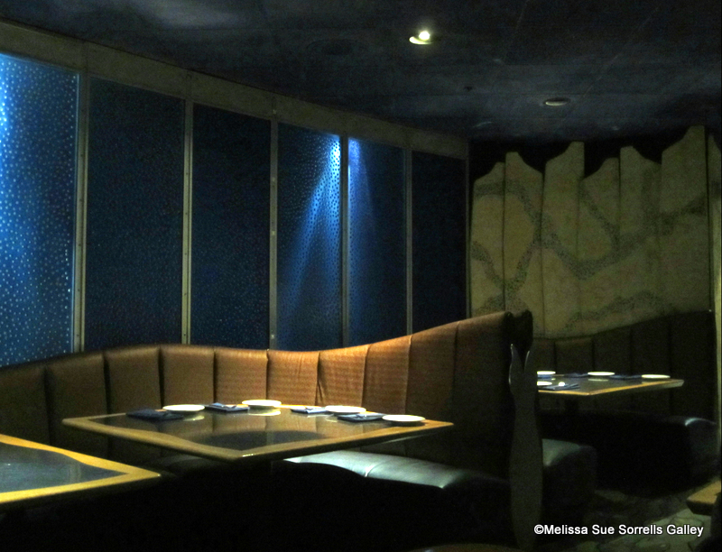 Back in the dining room, the lighting is kept low, and the details in the dining room are covered in mosaic blue, gray, and green tile, all in keeping with the undersea theme. Even the effects on the ceiling, wavy and variable, made us feel as if we had been transported 20,000 leagues below the waterline.