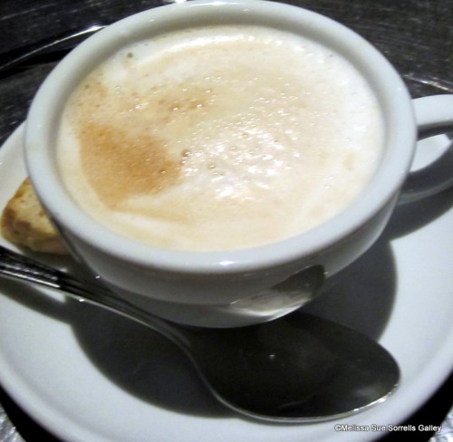 For dessert, we decided to tackle the Baileys and Jack Daniel’s Mousse as well as the Cheesecake Napoleon. I also ordered a cappuccino, my post-meal drink of choice when a late night at the parks looms before me. The coffees at Coral Reef were served with biscotti, which were very doughy, but also almond-y and delicious.