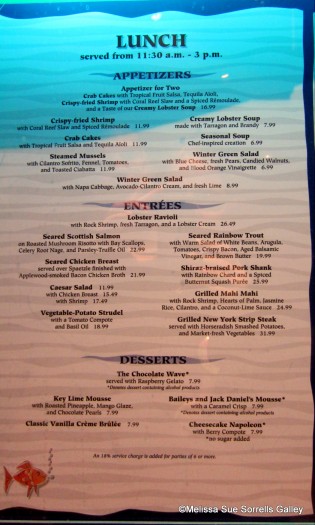 Our only bad experience at Coral Reef was on our honeymoon in 1993. We returned several years ago and enjoyed CR for many trips. It has fallen off of our list again because the yummy catfish disappeared from the menu. While the lobster ravioli is delicious (our waiter even made sure it had few, if any, scallops in the sauce for me – I see it’s only shrimp in the sauce now), the catfish is what kept bringing us back. None of us care for mahi mahi, trout, or salmon… The creme brûlée, however, is my favorite!