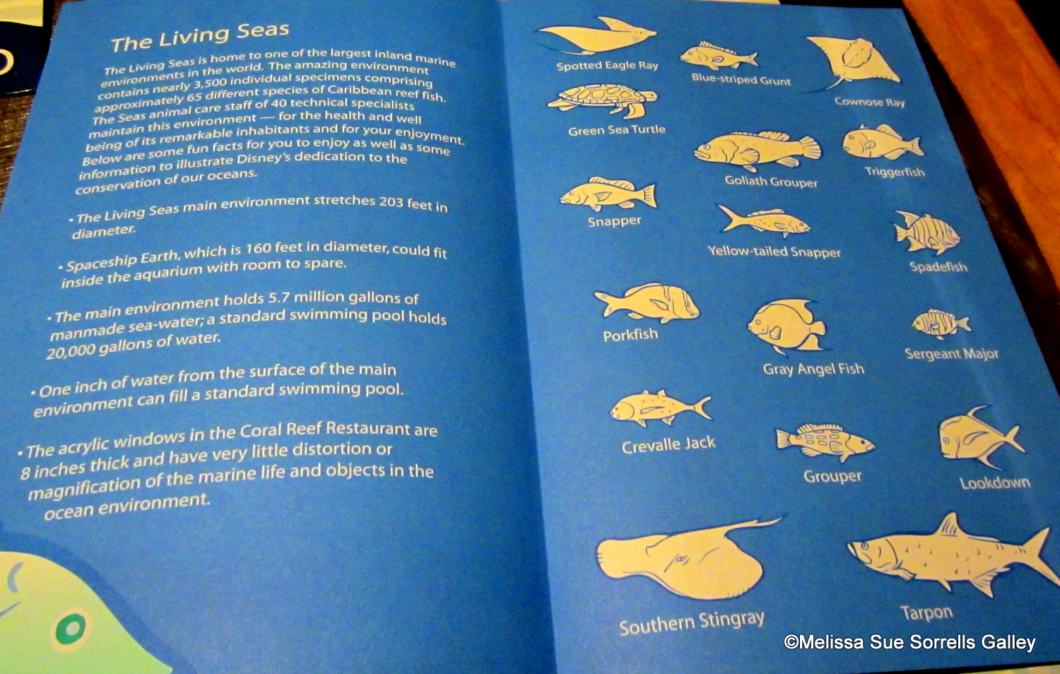 When we were seated, our waitress brought us a handy fish guide with line drawings of many of the fish and other life forms living in the tank as well as some fascinating facts about the Living Seas.