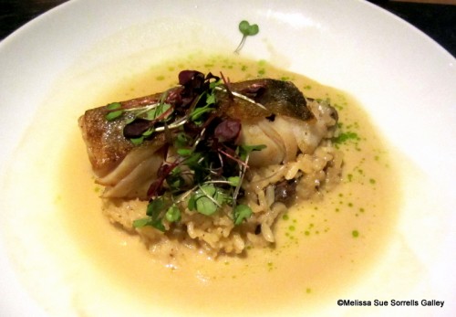 The sustainable fish was a cod served on mushroom risotto with bay scallops. The waitress informed us in advance that the fish was delicate and prone to flaking, so they seared it with the skin on. When it came out, the cod was indeed flaky, but the skin was crunchy, fatty, and absolutely delicious.