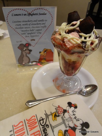 For the run of Lady and the Tramp up at El Capitain Theatre in Hollywood, Disney’s Soda Fountain and Studio Store is offering another featured sundae! This time, it’s the L’amore e un Spaghetti Sundae — an adorable sundae designed to look like it came straight out of Tony’s Italian Restaurant from the movie.