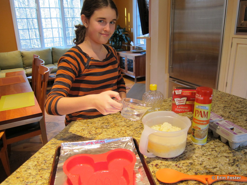 Louisa prepared the cake batter, and we filled the pan. Per package instructions, we didn’t fill it all the way to the top.