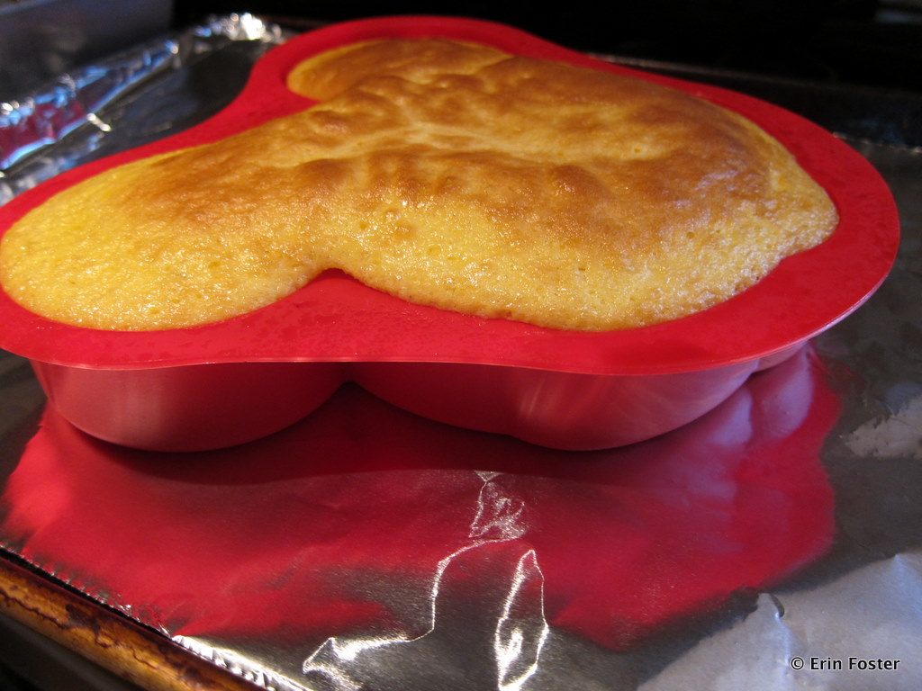 For the sake of simplicity, we decided to use a boxed cake mix. And as the pan’s packaging suggested, we placed the pan on a cookie sheet for stability and ease of transport from counter to oven.