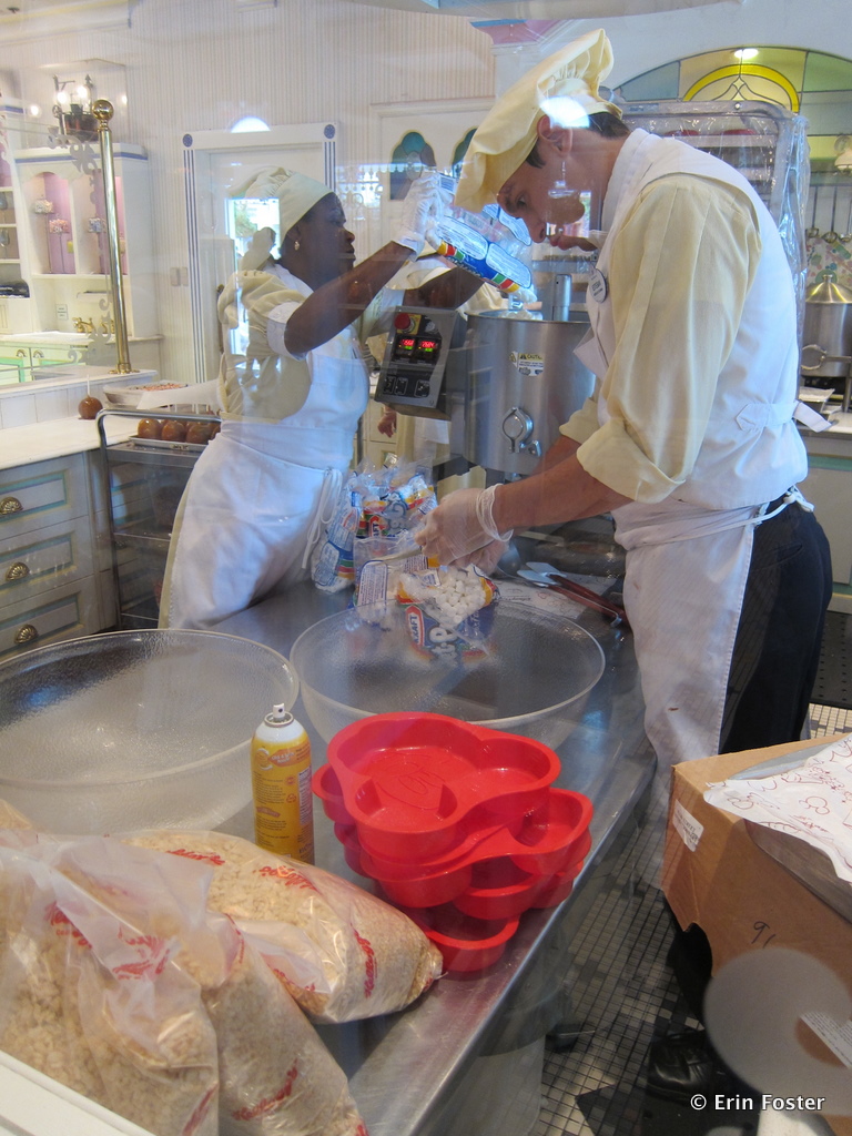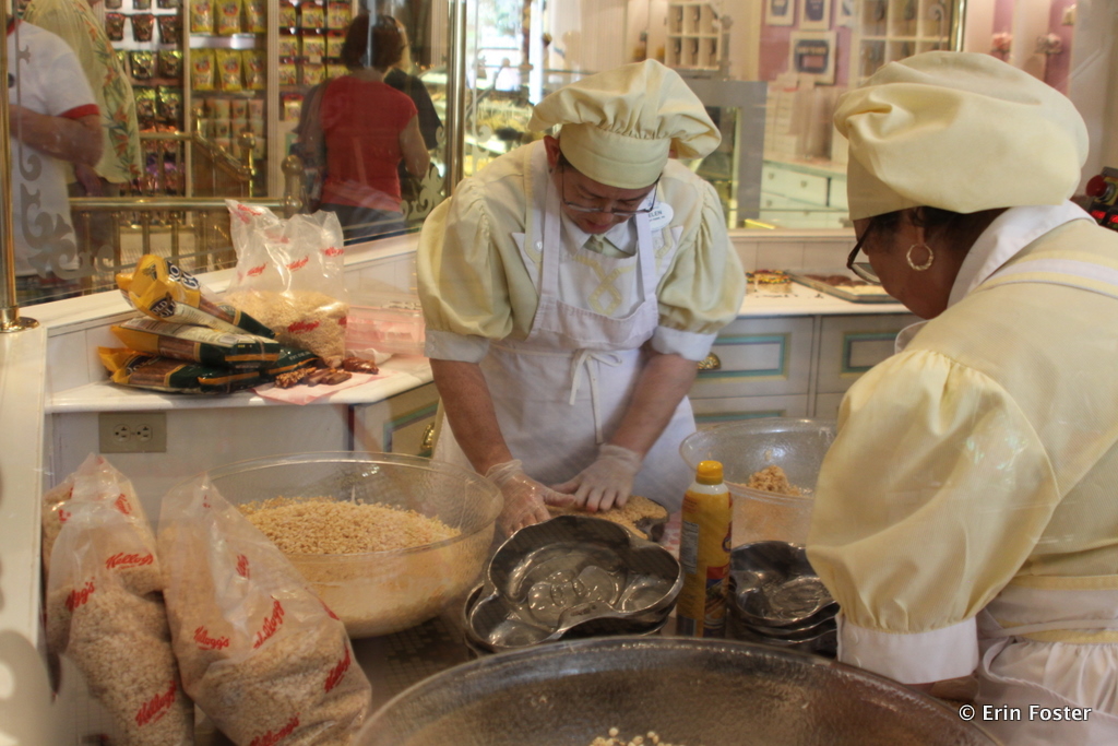 One of my favorite pastimes is watching the cast members in the glass-walled kitchen create the specialties of the house: fudge, cake pops, chocolate-covered pretzels, candy apples, or Mickey-shaped krispie treats. I consider myself a bit of krispie artist, so the creation of these particular treats holds a special fascination for me.
