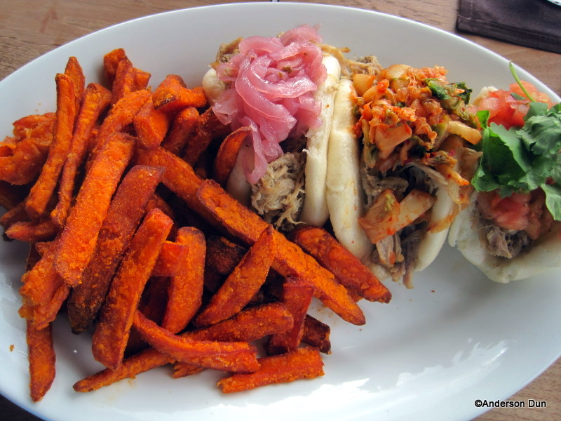 From left to right, the tiny buns were topped with pickled onions, kim chee, and chopped lomi tomato (“lomi” means massage, so the tomatoes are “massaged,” or rather, chopped finely with onions). They each provided a nice surprise to accompany the roast pork flavor. The sweet potato fries were also very good.