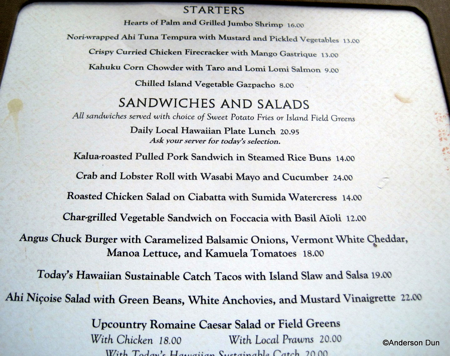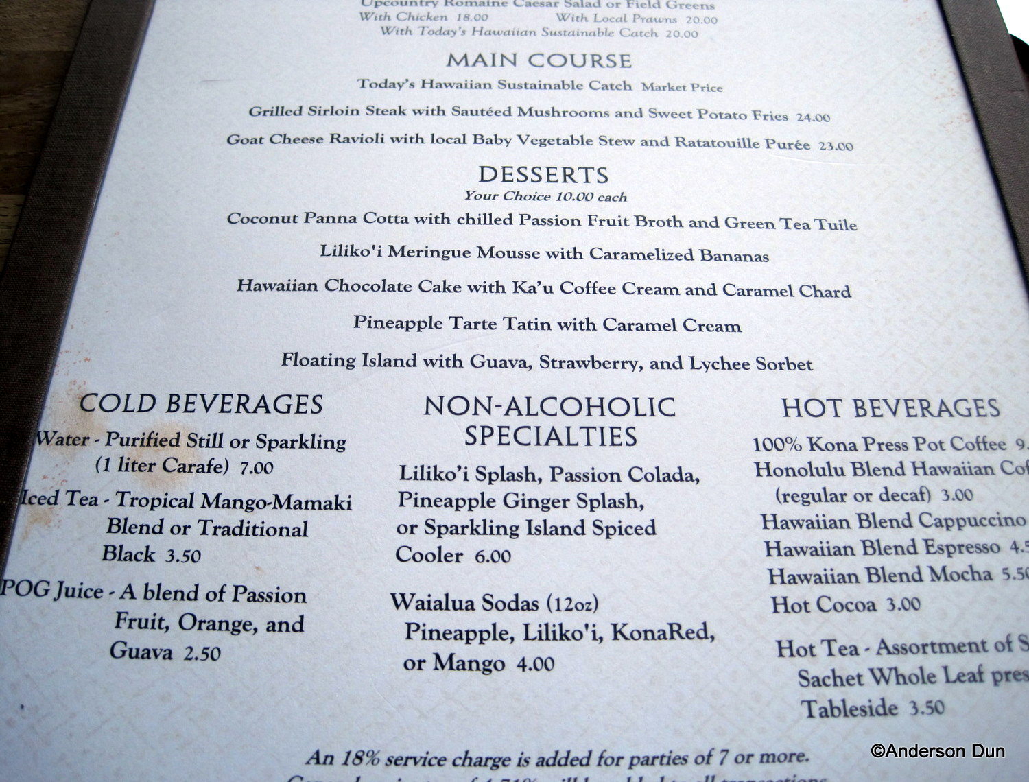 After doing some shopping at the gift store and meandering about the resort property, we headed back to ‘Ama’Ama at around 12:15 to see if they could seat us. Fortunately, they were able to take us to a table right away.