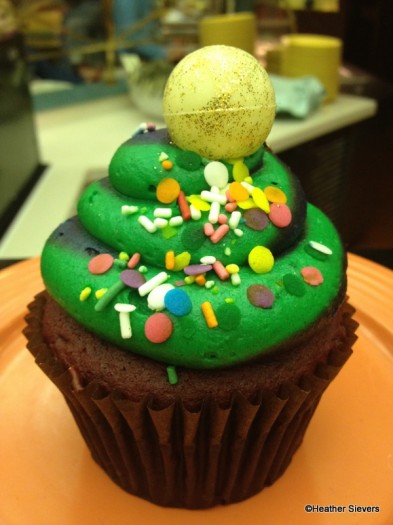 The first cupcake was a chocolate raspberry-filled deal with a huge mound of what appeared to be a ganache-type topping that covered the mound of frosting underneath. I asked a cast member what the cupcake consisted of and he told me “lots of frosting with a raspberry filled center.” Topped with a fancy cookie mask, edible gold foil, glittery green and purple gel frosting, and a fresh raspberry, this cupcake is a work of art!