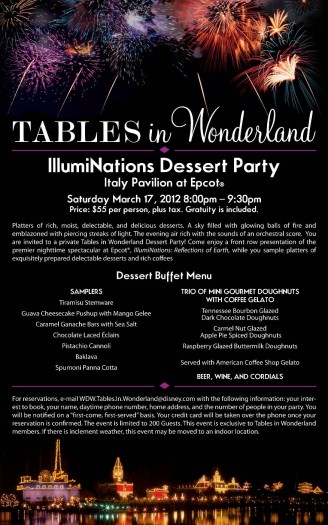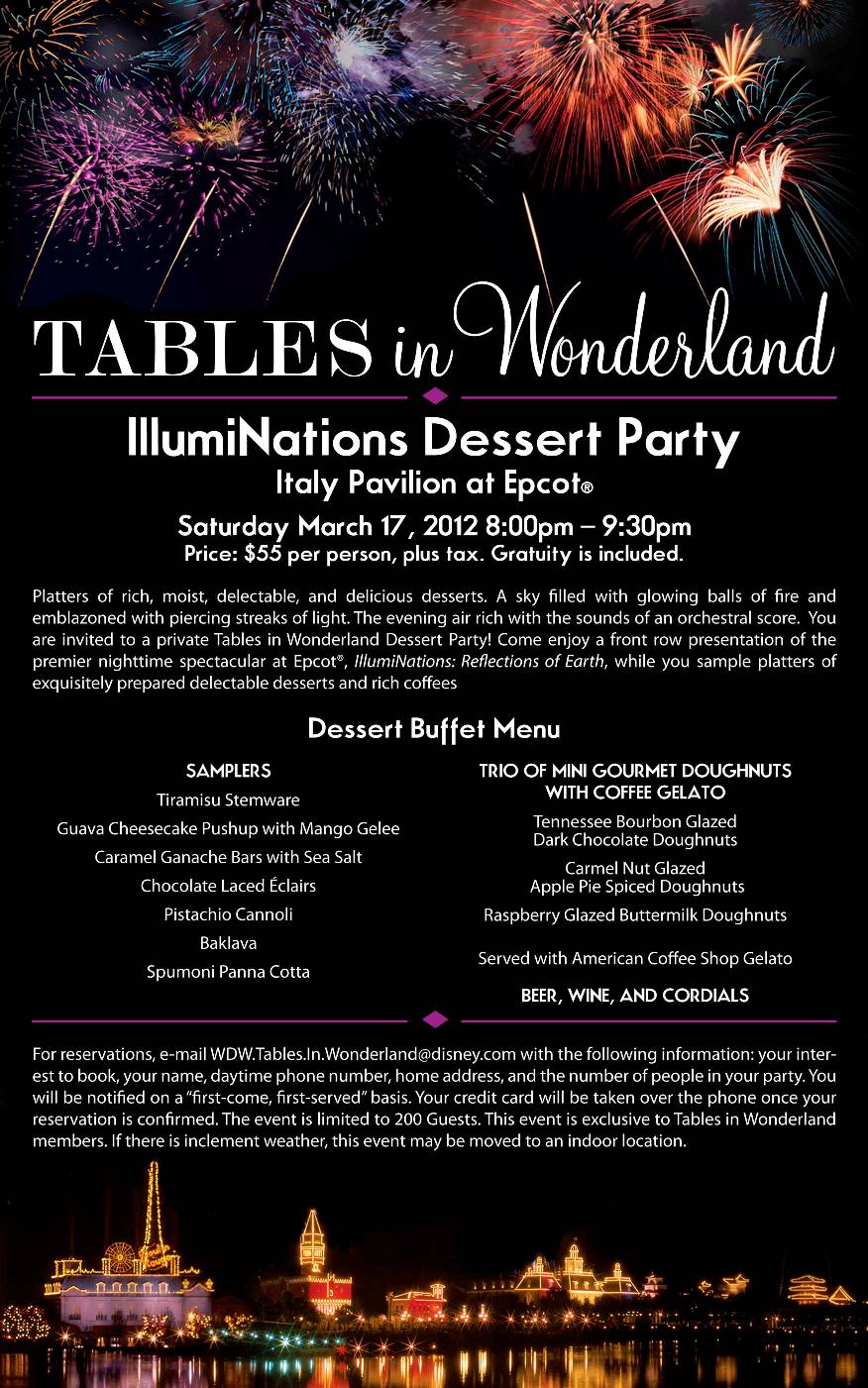 You are invited to a private Tables in Wonderland Dessert Party! Come enjoy a front row presentation of IllumiNations: Reflections of Earth, while you sample platters of delectable desserts and rich coffees.