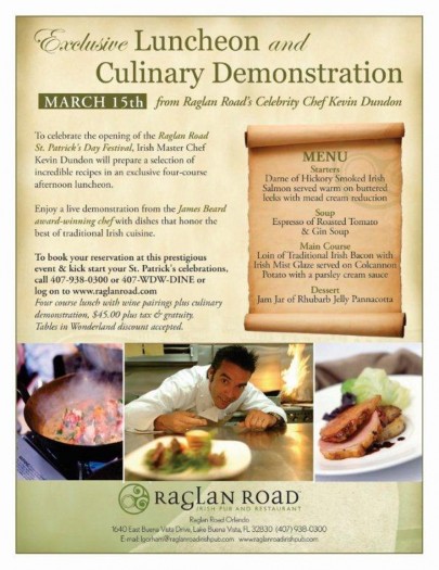 I’m SO excited I get to go to this!!!! 🙂 Join Raglan Road’s Celebrity Chef Kevin Dundon on March 15th at Raglan Road Irish Pub and Restaurant. This event celebrates the opening of the Raglan Road St. Patrick’s Day Festival. A selection of incredible recipes in an exclusive four-course afternoon luncheon will be presented with wine pairings.