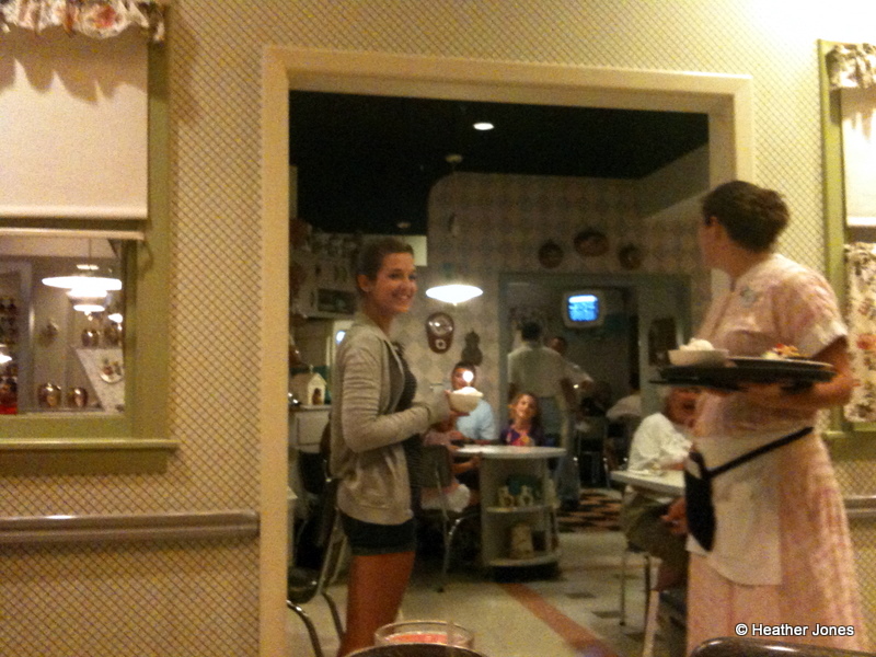 The first time my family and I went to DIsney World, November 2005, we ate at the 50s Prime-Time Cafe. I remember laughing through our entire, delicious meal. My mom, who ordered a meatloaf dinner, didn’t want to finish her salad, thinking it would spoil the rest of her dinner. Our waiter, whose name was Uncle Tim (I remember because I, too, have an Uncle Tim) told her to finish it, and he’d be back around to take her plate. When he returned, my mom still hadn’t finished the salad. Uncle Tim pulled a chair up and sat next to her, picked up her fork, and started feeding the salad to my mom. I thought it was hysterical. My mom was a little mortified and a lot embarrassed. She didn’t want to finish her meal, so Uncle Tim said he wasn’t going to bring her dessert. And when he brought the rest of us, our desserts, my mom’s was missing. Overall, I had a blast laughing at my mom. 🙂