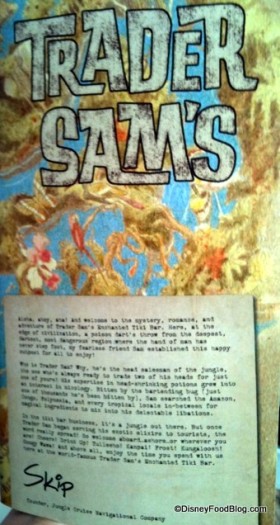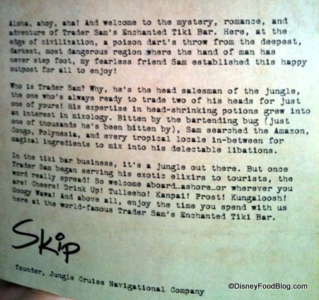 These are the words that lure you into Trader Sam’s story when you first look at a menu in this brand new Tiki bar in the Disneyland Hotel! In fact, a good friend of mine has referred to it as “the best of the Jungle Cruise, Adventurers Club, and Tiki Room rolled into a liquor license.” I heartily agree.