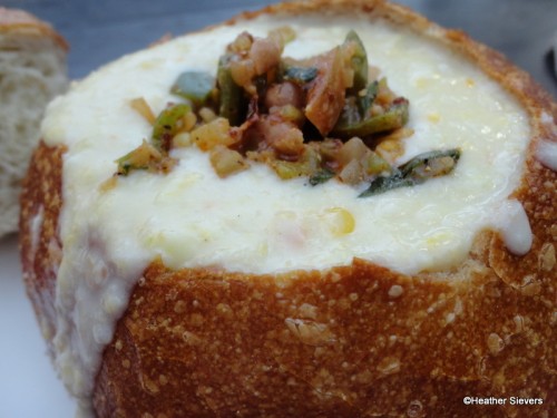 The chowder, described as “Southern Style Corn Chowder garnished with Roasted Corn and Black Eye Pea Maque Choux,” is served up in a warm sourdough bread bowl with a side of oyster crackers.