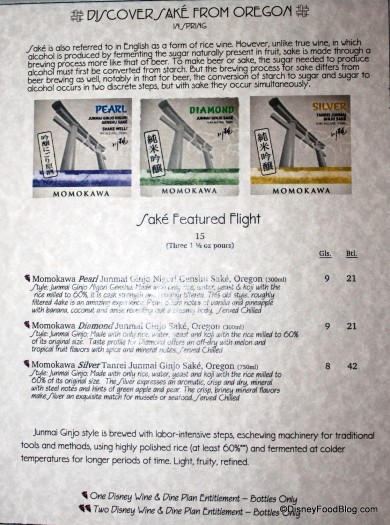 I couldn’t help but order it, since I’d been having a Sake-esque trip anyway (new Sake cocktail in Epcot’s Japan, for example). This sake flight was from Momokawa sake company — in Oregon! Yep, this was all American-made sake; very interesting!