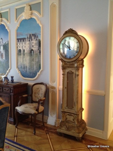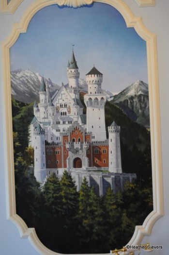 On to the parlor for more fantasticness. The parlor is very “princess” based. The room is a lovely blue color and features glass figurines, a pretty glass slipper, a gorgeous painted mirror, and murals of the two castles that inspired the Sleeping Beauty Castle at Disneyland: Neuschwanstein Castle in Germany and the Chateau d’ Usse in France.