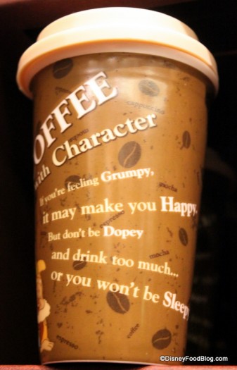 Snow White’s seven dwarfs are pictured on the opposite side of this tumbler with a caffeine warning. “Coffee with Character. If you’re feeling Grumpy, it may make you Happy. But don’t be Dopey, and drink too much… or you won’t be Sleepy”.