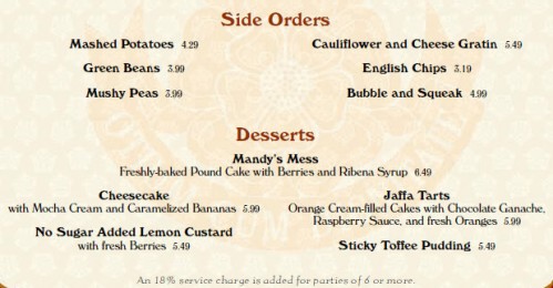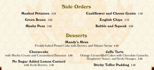 Boy, I’m surprised to see not only the Bangers & Mash leave the dinner menu, but the hen as well! The only chicken dish now is a curry? No roasted bird option feels wrong for some reason… maybe that’s just my Dickensian imagination of what British food is. 🙂